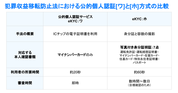 現在、eKYC(オンライン本人確認)で主に採用されている[ホ]方式との比較では、[ワ]方式の方が利用者の所要時間が短く、審査の時間も即時で終わるため、利用者がマイナンバーカードを保有している場合、公的個人認証サービスの方がスムーズに本人確認が完了します。
