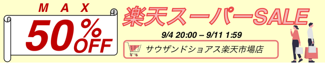 2023年9月4日(月)~ 11日(月)まで楽天市場で開催される楽天スーパーSALEにて、サウザンドショアス楽天市場店内の30の商品を最大50%OFFで販売いたします。28時間限定300円OFFクーポンも配布。