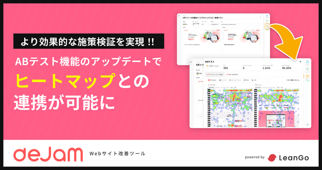 株式会社LeanGo (本社:東京都目黒区、代表取締役:平井 翔吏、以下 弊社) は、自社の運営するWebサイト改善ツール「dejam」のABテスト機能をアップデートしたことをお知らせいたします。今回のアップデートでは、ABテスト検証結果画面から、そのまま該当Webページのヒートマップに飛べるようになりました。これにより「dejam」の操作性が格段にアップし、施策の振り返りをより簡単に、正確に行なっていただけるようになりました。