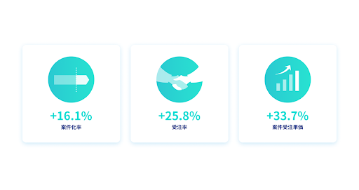 これまでのテストユーザーによる約半年間の利用を通じ、商談の案件化率は16.1%、受注率25.8%、案件単価33.7%の改善が確認されました。