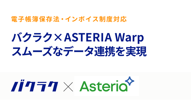 株式会社LayerX(本社:東京都中央区、代表取締役CEO:福島 良典、以下LayerX)とアステリア株式会社(東証プライム市場:3853、本社:東京都渋谷区、代表取締役社長:平野 洋一郎、以下 アステリア)は、法人向け支出管理サービス「バクラク」とアステリアが提供するデータ連携ツール「ASTERIA Warp(アステリア ワープ)」において、業務提携を発表しました。第1弾として、電子帳簿保存法・インボイス制度に対応した「バクラク電子帳簿保存」と、「ASTERIA Warp」との連携を開始します。 https://bakuraku.jp/