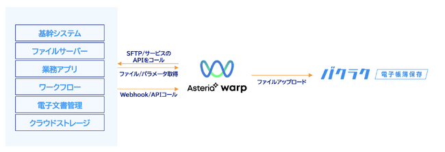 連携の第1弾として、バクラクシリーズ内の電子帳簿保存法、インボイス制度に対応したクラウドストレージ製品である「バクラク電子帳簿保存」とASTERIA Warp(アステリア ワープ)」の連携を開始します。これにより企業は、自社が管理する基幹業務システム内やクラウドストレージ内に保存されている証憑類を「バクラク電子帳簿保存」にシームレスに転送保管することが可能となり、2024年1月に施行予定の電子帳簿保存法への対応に寄与します。