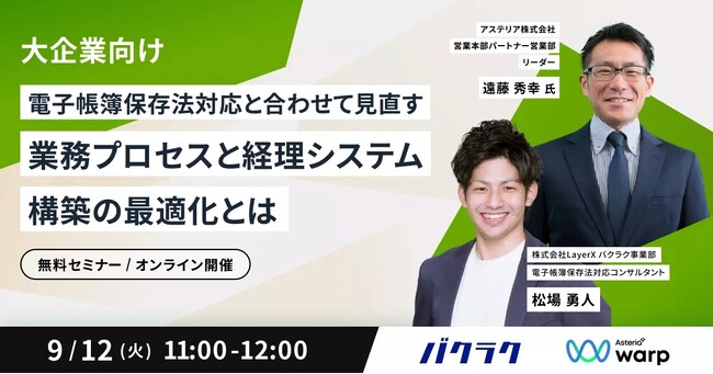 LayerX、アステリアの共催で、大企業向けに電子帳簿保存法対応と並行した業務プロセスと経理システム構築について解説します。
