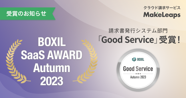 リコーグループのメイクリープス株式会社(本社:東京都目黒区、代表取締役社長:児玉哲、以下メイクリープス)が提供するクラウド型請求管理サービス「MakeLeaps(メイクリープス)」は、スマートキャンプ株式会社(以下「スマートキャンプ」)が今最も評価されているSaaS(※1)を表彰する「BOXIL SaaS AWARD Autumn 2023」請求書発行システム部門で「Good Service」に選出されたことをお知らせします。「BOXIL SaaS AWARD Autumn 2022」より5期連続の受賞となりました。