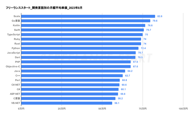 具体的な月額平均単価は1位「Scala」が82.6万円(前月比±0円・増減なし)、2位「Go言語」が79.6万円(同+1千円・0.13%増)、3位「Kotlin」が76.6万円(同+1千円・0.13%増)でした。