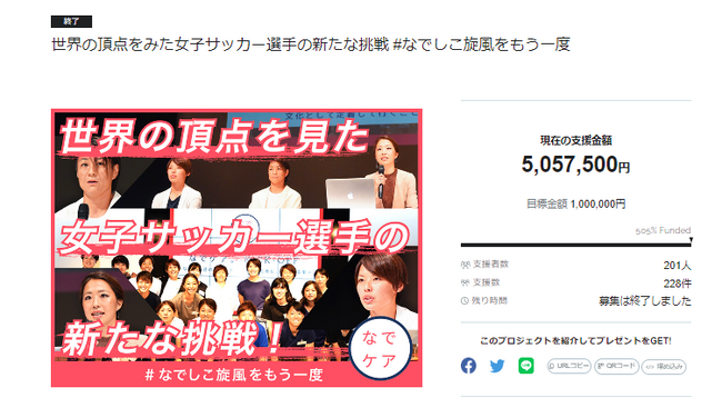 1.一般社団法人 なでしこケア「世界の頂点をみた女子サッカー選手の新たな挑戦 #なでしこ旋風をもう一度」プロジェクト、目標金額100万円達成!
