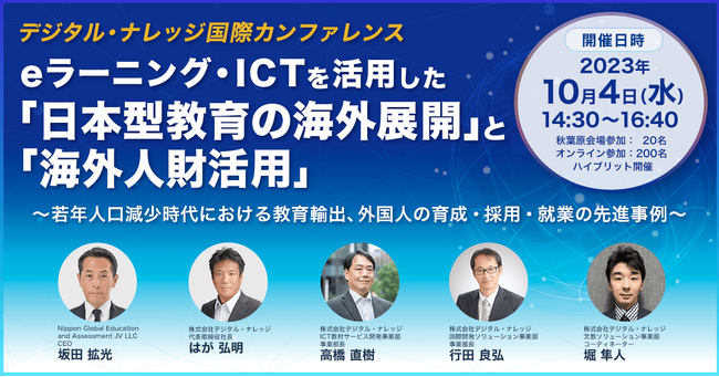 導入実績2000超を誇る 1995年創業のeラーニング専門ソリューション企業、株式会社デジタル・ナレッジ(本社:東京都台東区、代表取締役社長:はが弘明)は、2023年10月4日(水)、国際カンファレンス「eラーニング・ICTを活用した『日本型教育の海外展開』と『海外人財活用』」を開催致します。(https://www.digital-knowledge.co.jp/online-conference/?pr)