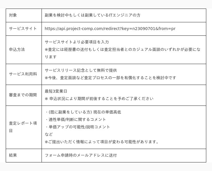 エンジニア向け給与データベースサービス『PROJECT COMP(プロジェクトコンプ)』(https://project-comp.com/)を提供する株式会社PROJECT COMP(本社:東京都渋谷区、代表取締役:田川啓介)は、ITエンジニア向け副業適性単価査定サービスを開始いたしました。職務経歴や開発実績を元に査定し、副業を受ける際の適性単価を算出します。