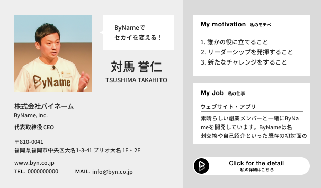 代表取締役CEOの対馬 誉仁がG’s Academy(ジーズアカデミー/ https://gsacademy.jp/)と出会い、「セカイを変える」と「プロトタイプを作る」という理念に共感してその場で入学を申し込んだことがすべての始まり。卒業制作で担当メンターとなったFounderの児玉浩康さんの指導を仰ぎながら、ByNameの事業企画とプロトタイプを制作。2023年5月18日に同校主催のGGA(Global Geek Audition / ピッチコンテスト)にてByNameを発表し、同日に法人を設立登記。GGAをきっかけに出会った熱い創業メンバー4名とプロダクト開発を行い、2023年9月7日に無料版をリリース。今後はAIを活用しつつ、単なるプロフィール登録・交換を超えた先進機能を拡充予定。メール署名の拡散効果により、2024年7月までに10,000ユーザーを獲得することが当面の目標。