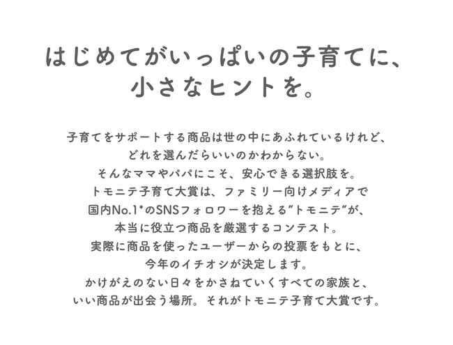 SNSフォロワー数No.1*子育てメディア『トモニテ』のユーザーのリアルな声から、本当に役立つ商品を厳選することで、新しい商品との出会いの機会につなげ、子育てに関わるすべての方々の育児ライフを豊かなものにしたいと考えています。