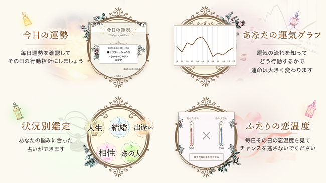 さらに、弊社が運営する占いポータルサイトmarouge(https://marouge.jp/)とアカウントを共通でご利用いただける仕組みも導入され、marouge内の無料コラムやコンテンツも都度ログインなくご覧いただくことが可能になりました。