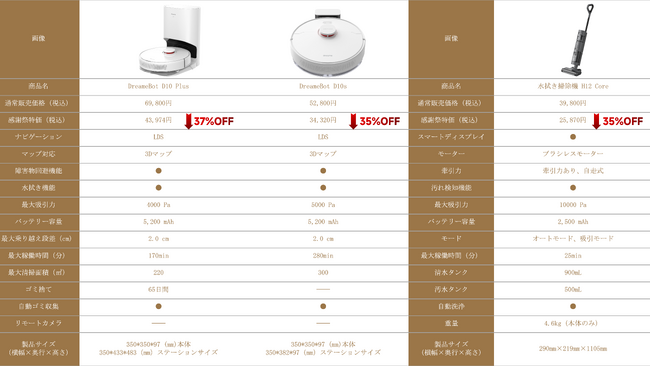 2023年10月11日、高速デジタルモーター性能世界トップクラス、急成長を遂げる家庭用床掃除機の総合メーカーDreame Technologyの日本支社であるドリーミーテクノロジージャパン株式会社(東京都大田区/代表取締役社長 高野亮子)は、当社が展開するロボット掃除機「DreameBot D10 Plus」「DreameBot D10s」、水拭き掃除機「Dreame H12 Core」を対象とした最大37%OFFのキャンペーンを、2023年10月14日(土) 0:00から10月15日(日) 23:59までの48時間のAmazonプライム感謝祭期間中、Amazonショップ内にて実施いたします。