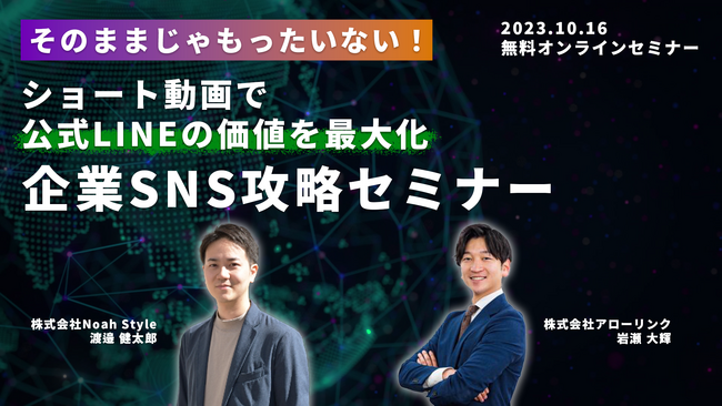 株式会社アローリンク(本社:兵庫県神戸市、代表取締役:蓬莱和真)と株式会社Noah Style(本社:東京都板橋区、代表取締役:冨永 心大)は、2023年10月16日に「そのままじゃもったいない!ショート動画で公式LINEの価値を最大化 企業SNS攻略セミナー」と題し、無料のセミナーを開催します。LINE公式アカウント・ショート動画の基本的な活用から売上を加速させ、ショート動画で公式LINEの価値を最大化するコツをお伝えします。