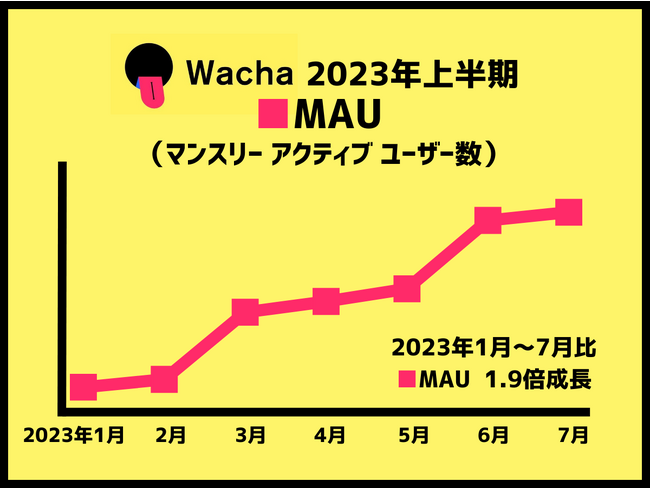 WachaアプリのMAU(マンスリーアクティブユーザー数)は、2022年10月以降の「貢献報酬」システム導入後、2023年1月から7月の7ヶ月間で1.9倍成長しました。これは、アプリを月間アクティブに利用するユーザー数が前年と比較して1.9倍に増加したことを示し、Wachaコミュニティの活性化とアクティビティの増加を反映しています。