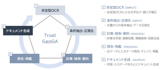 「Trust GenGA」は、金融業界の事務に共通する5つの基本的な振る舞いに焦点を当て、効果的な利用を可能にするAI技術の検証を行っています。