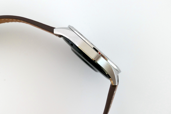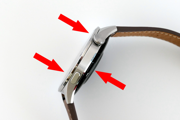 ケースの右側には2つの物理ボタンを搭載。リューズを模した上のボタン(2時位置)はメニュー画面を表示でき、回してスクロール操作も行えます。下の機能ボタン(4時位置)を押すと、「ワークアウト」のメニューが表示されますが、他の機能やアプリに変更することもできます。
