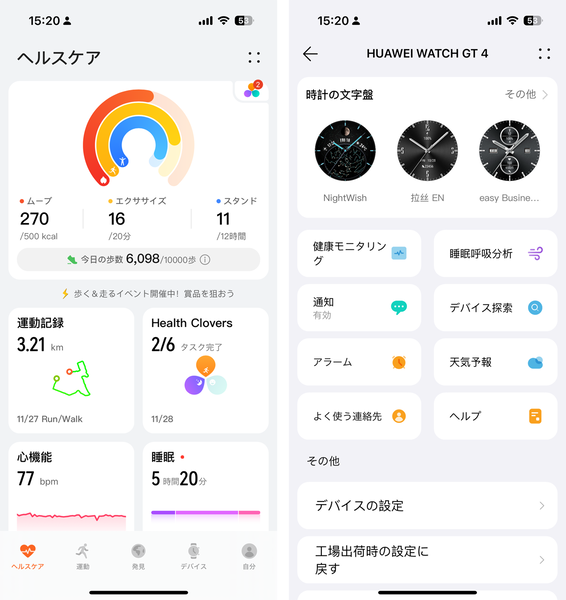スマホには「HUAWEIヘルスケア」というアプリをインストールして使います。iOSとAndroidでは使える機能に若干差があります。Androidでは電話を着信した際に「カスタムクイック返信」ができますが、iOSは非対応。また、スマホにインスールした音楽を同期して、ウォッチ単体で再生する機能もiOSでは使えません。