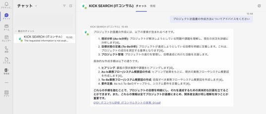 KICK SERACHでは回答生成にOpen AI社が提供する GPTを利用することで、社内のあらゆるデータから情報を要約し回答を生成するだけでなく、参照した資料の格納場所も提示することでより精度の高いナレッジ検索を実現しています。