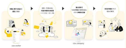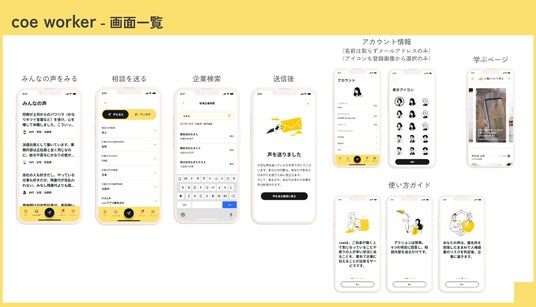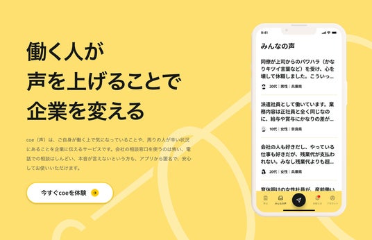 労働者の困った状況を解決支援する新アプリ「coe worker」自身だけでなく友人・同僚・家族の状況を匿名で会社に伝えられる