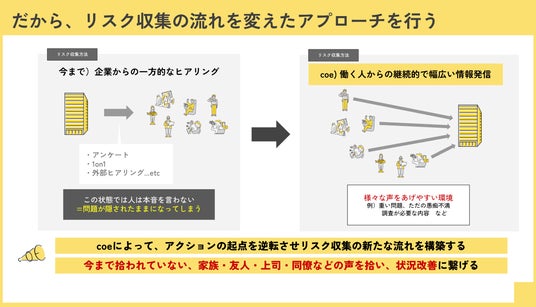 このような問題を解決するために、株式会社Dropでは労働者の声を拾い上げるアプリcoe workerと、リスクを可視化するAI/webサービスcoe companyを開発しました。