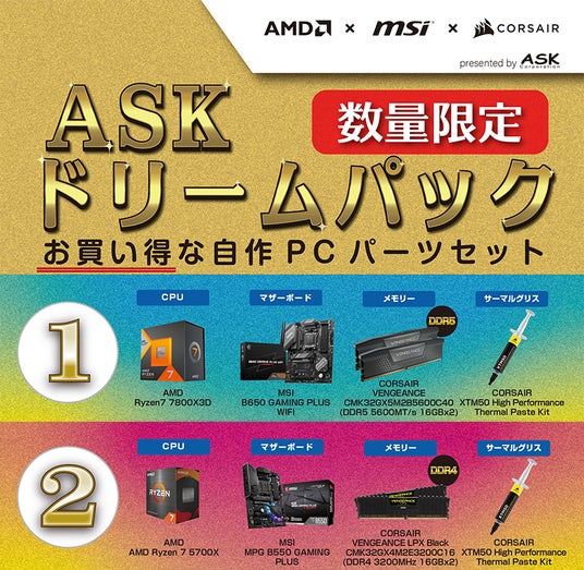 「ASKドリームパック 1」には、AMD社のプロセッサ「AMD Ryzen 7 7800X3D」、MSI社のマザーボード「B650 GAMING PLUS WIFI」、CORSAIR社製メモリ「VENGEANCE DDR5-5600 32GB」とサーマルグリス「XTM50」の4点をセットに、