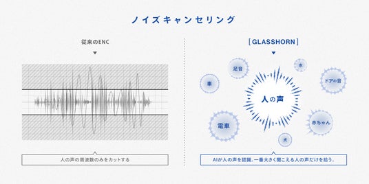 従来のENCノイズキャンセリングと[GLASSHORN]のノイズキャンセリングを比較