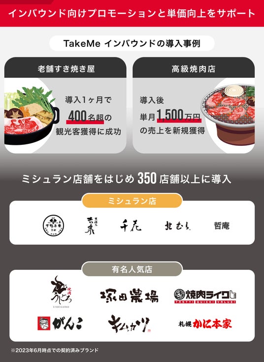 いずれのサービスも、インバウンドの復活に伴い売上が順調に拡大しています。例えば「TakeMe インバウンド」は、導入1ヶ月で400名を超える訪日外国人観光客の獲得に成功した老舗すき焼き店や、単月で約1,500万円の売上を新規獲得した焼肉店など成功事例を多く生み、現在はミシュラン店舗をはじめ、350店舗を超える飲食店のインバウンドプロモーションをサポートしています。