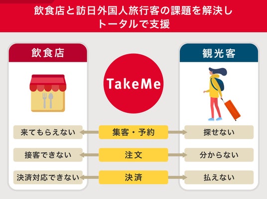 観光客専用の食事コースを事前決済型予約で販売する「TakeMe インバウンド」、世界130以上の決済ブランドでのキャッシュレス決済を可能にする「TakeMe Pay」、テイクアウトなどの注文ページを簡単に作成できる「TakeMe Order」を展開しています。