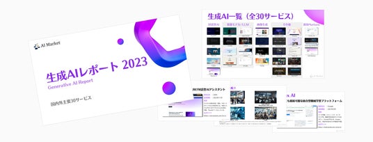 AI Marketでは、2023年までに提供開始された国内外の主要生成AI 30サービスをまとめた、全42ページにおよぶ「生成AIレポート 2023」を作成、公開致しました。