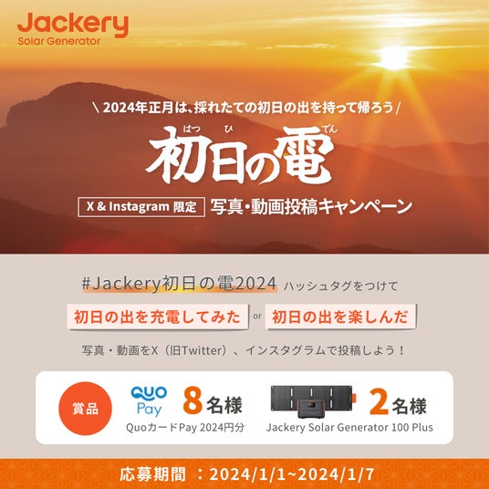 ポータブル電源・ソーラーパネルの世界的リーディングカンパニー・Jackeryの日本法人である株式会社Jackery Japan(所在地:東京都港区)は、2024年1月1日(月)から2024年1月7日(日)まで、Jackery Japan公式XとInstargramアカウントで、お正月限定の「Jackery 初日の電 2024」特別キャンペーンを開催します。