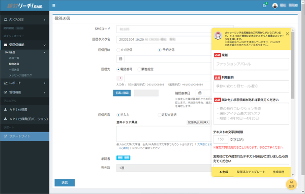 AI CROSSは1月4日より、SMS送受信サービス「絶対リーチ!SMS」に新機能「AIテキスト生成」を追加し、30社を対象にモニター版の無償提供を開始する。