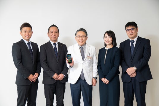 恵寿総合病院 神野正博理事長(中央)とコンソーシアムの主要メンバー(右から2人目:エム・シー・ヘルスケア事業開発部長 松本恵理子 )