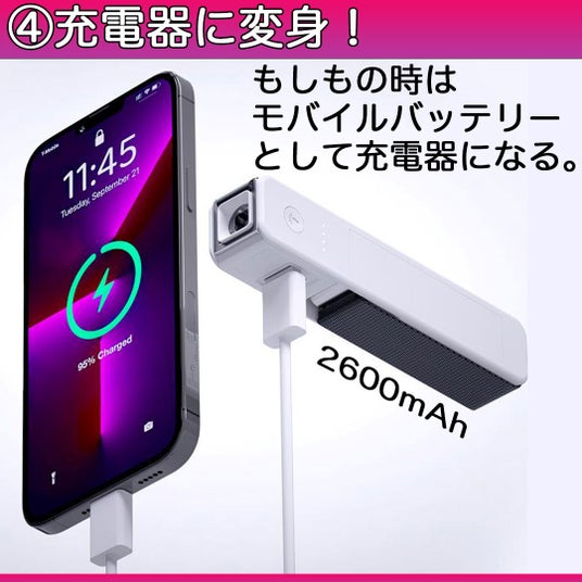 - もしもの時に本体から充電が可能!屋内は勿論、野外や災害時にとても重宝する超便利な多機能ライト!