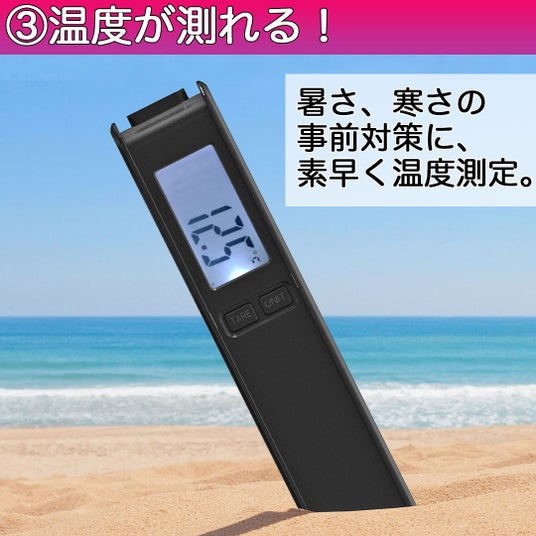 夏場の野外、車内の温度が測定でき、体調管理や熱中症などの危険回避に役立ちます。