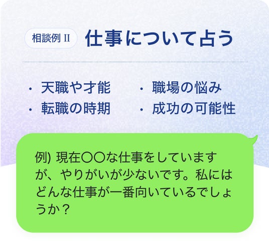 「AI占いくん」は、LINEで悩みを相談できる本格占いサービスです。LINEのチャット上で、AI占い師に対面占いのように運勢や将来について相談することができます。無数のパラメータを駆使したAIを活用することで、いつでもどんなことでも気兼ねなく相談でき、より一人一人に合った占い結果を鑑定できます。現在は、オーラ占いとタロット占いに対応しております。