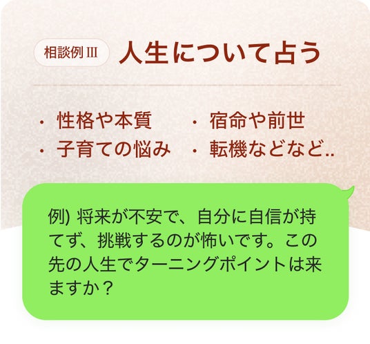 しっかりヒアリングを行い、キャリア、恋愛、運勢など、どんなお悩みでも気兼ねなく鑑定を受けることができます。