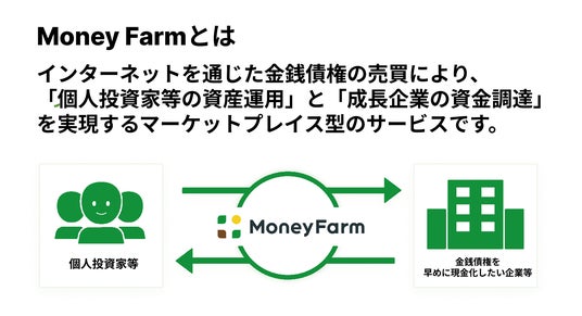 ●金銭債権を売却して早期に現金化したい企業等向け 将来的に売上を得ることが見込めるものの、事業の急成長等に伴いキャッシュフローの問題で事業拡大のアクセルを踏めない企業等が、インターネット経由で不特定多数の個人に金銭債権を売却できる新たな選択肢を提供することで資金調達方法の選択肢が広がる。 創業間もない、決算書が赤字等の事情で資金調達が困難なスタートアップ企業等でも、信用力の高い企業等が債務者となる金銭債権を有していれば、これをMoney Farmで現金化することで資金調達が可能。 これまで金銭債権の現金化を行うという取り組みは、ネガティブな印象を持たれるケースも多かったが、Money Farmを活用して取り組むことで、資金調達を図りながら、自社の取り組みのアピール、ファンを形成するマーケティング目的にも活用することも可能。