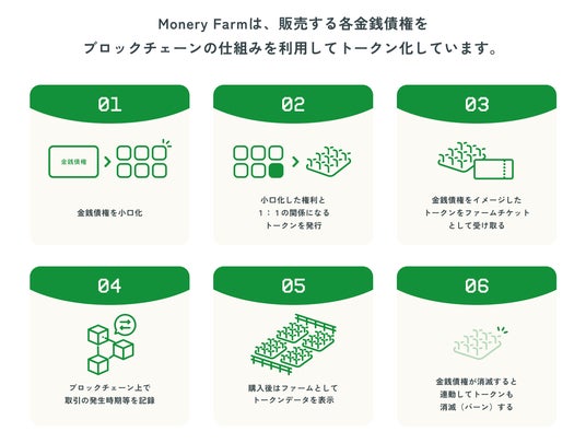 Money Farmでは、「小口化」、「トークン化」した金銭債権を「ファームチケット」と総称し、個人等が少ない予算(1万円から)でも資産運用を行うことができるとともに、保有する金銭債権を表象するNFTをマイページで所有・閲覧することで、楽しみながら資産運用ができるサービスを目指しております。