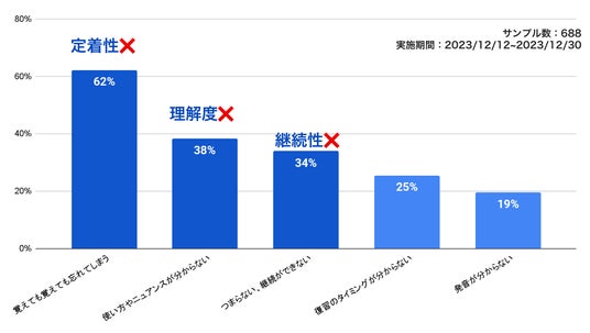 2023年12月12日~12月30日に弊社が英語学習者688名から回収してきたアンケートによると、単語学習における最も一般的な課題は、"覚えても覚えても忘れてしまう"(62%)というものでした。これは、従来の学習方法では長期記憶に移行しづらく、定着しにくいという問題を示しています。2番目に多かった回答は、「実際の使い方が分からない、ニュアンスが理解できない」(38%)であり、これは単語のコンテキスト理解の難しさを反映しています。そして3番目は「つまらない、継続できない」(34%)という意見が挙がり、学習へのモチベーション維持が重要な課題であることが明らかになりました。