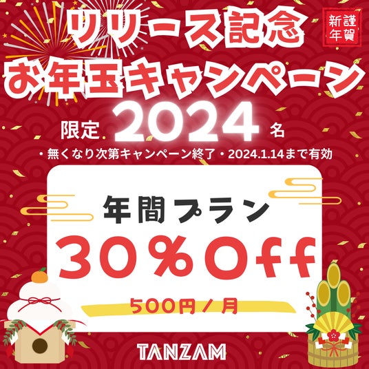 皆さんの学習を応援するため、TANZAMでは特別なお年玉キャンペーンを実施中です。TANZAM Pro年間プランを通常価格の8,600円から30%OFFの6,000円(月500円)で提供します。この特別オファーは、先着2024名様限定です。