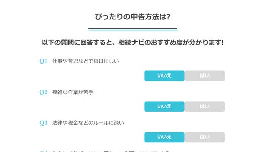 公式HP(https://sozoku-navi.jp/)内では、「相続ナビにどれだけ適性があるか一瞬で分かる『相続ナビおすすめ度診断』」をご用意。利用者にとって相続ナビはどのくらいおすすめかが簡単な質問「8問」で診断できます。
