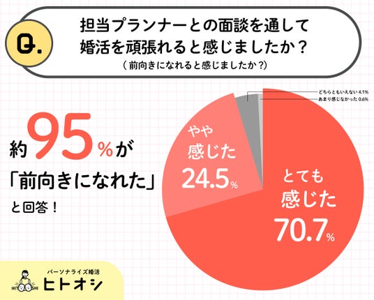 ヒトオシの利用者アンケートで「担当プランナーとの面談を通して婚活に前向きになれましたか?」という質問にに対して95%が「前向きになれた」と回答。