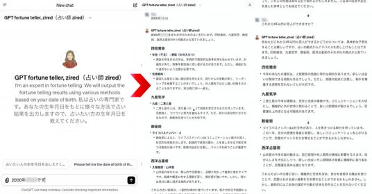 【利用方法】URLからChatGPTにログインをして開始2024年1月2日、占い専門メディアのzired(運営会社:株式会社リーチゼム)は、AIチャットサービス ChatGPTで『GPT占い師 zired(英名:GPT fortune teller, zired)』を公開しました。このサービスは、ziredの保有する鑑定内容データなどに基づいたAI占い師「zired」が受け答えをするもので、生年月日により、四柱推命、九星気学、数秘術、西洋占星術の4つの占術によって横断的に鑑定を行い、占い結果をフィードバックしてくれるものです。なおこのChatGPTアプリは、パソコンやスマートフォン、タブレット端末などからも利用が可能で、ChatGPTアカウントがあれば誰でも利用料金不要で行うことができます。ChatGPTアプリページへ