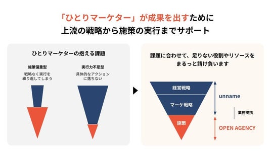 それらの課題を解決するため、BtoBマーケティングのコンサルティングに強みを持つ「unname」と、施策実働面を得意とする「OPEN AGENCY」が業務提携を行います。この提携は、迅速かつ確実なプロジェクトの成功と課題解決を支援する強固なマーケティング基盤を確立し、支援サービスの拡大と品質向上を目指します。