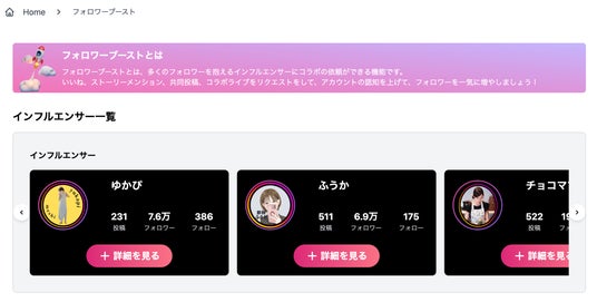 - コラボ相手を比較・検討できる複数のインフルエンサーから、自分のアカウントに見合ったコラボ相手を選ぶことができます。