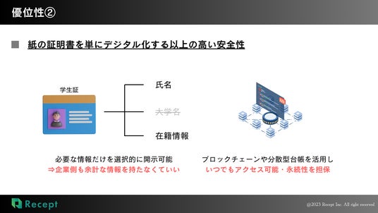 また保有する情報をユーザーが選択的に開示することができるため、従来の方式と比べ大幅にセキュアな形で個人情報の提出が可能です。