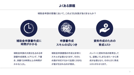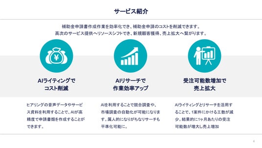 このサービスは、AI技術を活用し、補助金申請書類の作成時間を大幅に短縮し、効率化します。