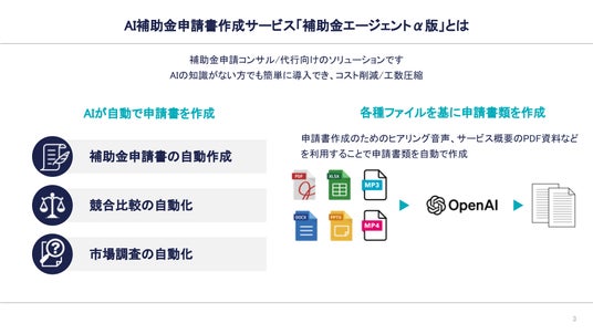 補助金申請書作成の時間を大幅削減!AI補助金申請書作成サービス「補助金エージェントα版」リリース!補助金申請のDXを促進