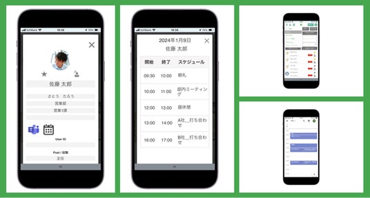 「Beacapp Here」ユーザー画面のメニューバーにある「スケジュール」から自身のスケジュールを確認することができます。また、他ユーザーのアイコンをタップすると表示されるユーザー詳細画面にあるカレンダーアイコンをタップすることで、他のユーザーのスケジュールも参照することが可能です。さらに、ホテリング機能を活用してオフィスのスペースを予約した際は、その情報が自身のスケジュールシステム上でも確認できるようになります。