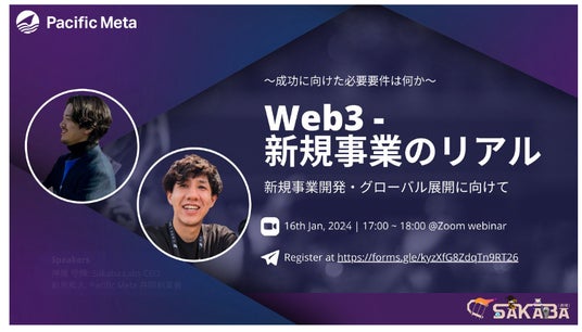 株式会社Pacific Meta(所在地:東京都品川、代表取締役:岩崎翔太、以下「Pacific Meta」)と、Web3サービス・ゲームの企画・開発を行っているSakaba Labs(FRITTO TECH PTE. LTD. 所在地: シンガポール、Director: Moriki Kamio、以下「Sakaba Labs」)は、2024年1月16日にWeb3領域での事業立ち上げをしたい方向けのWebセミナーを開催します。